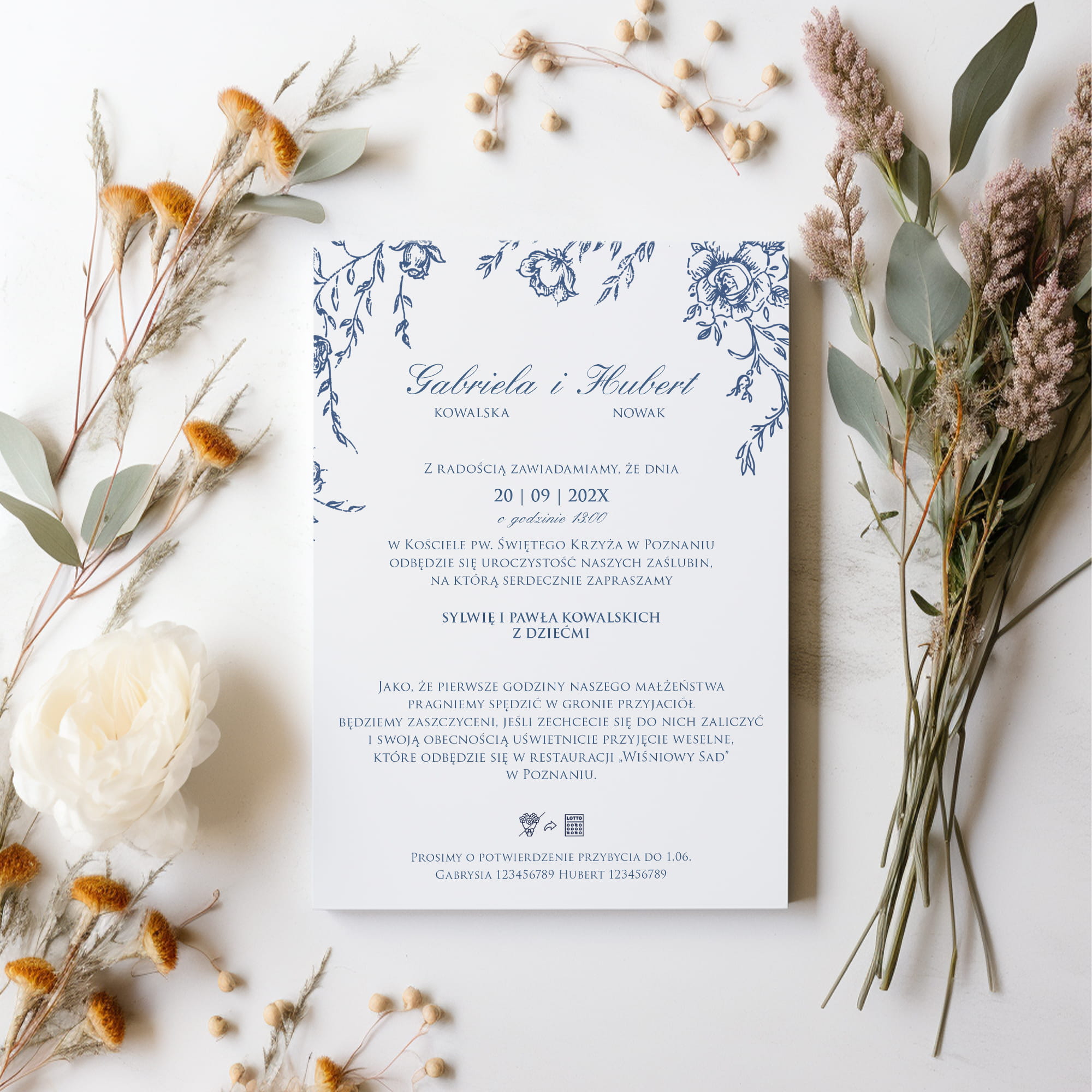 Dołącz do zamówienia treść zaproszenia uzupełnioną o wasze dane, miejsce ślubu i przyjęcia, telefonami z imionami do potwierdzenia, oraz wybrane cytaty i rebusy.