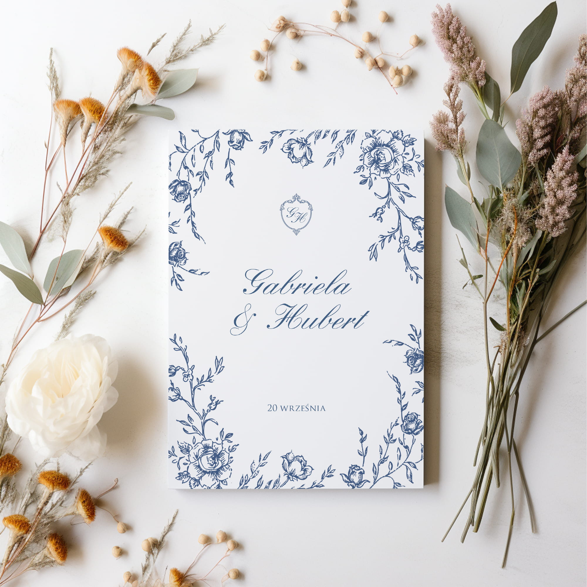 To zaproszenie ślubne z motywem niebieskich, stylizowanych kwiatów.