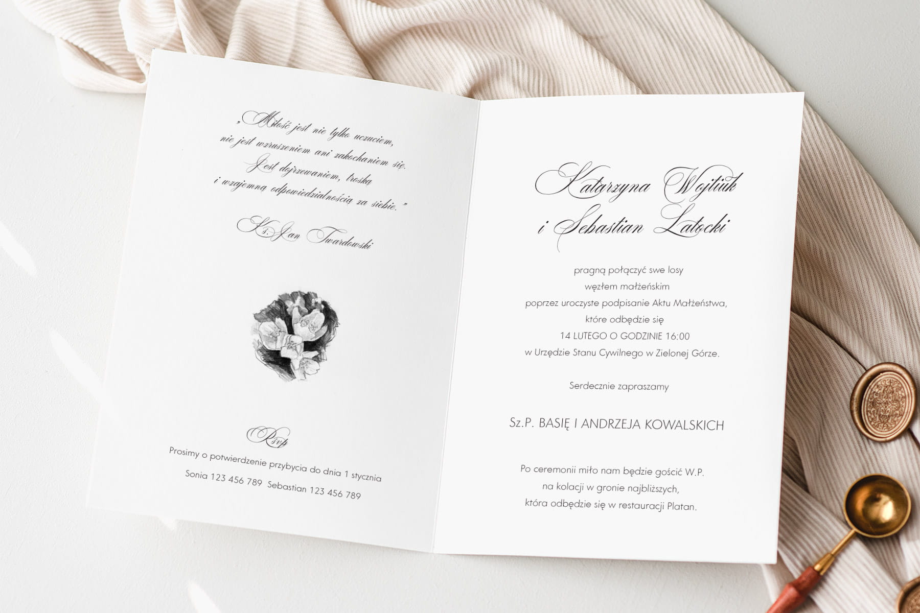 Dołącz do zamówienia treść zaproszenia uzupełnioną o wasze dane, miejsce ślubu i przyjęcia, telefonami z imionami do potwierdzenia, oraz wybrane cytaty i rebusy.