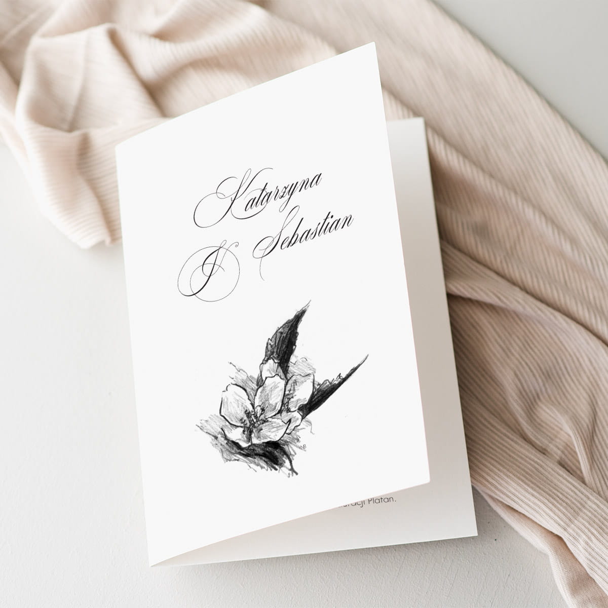 Zaproszenie proste w formie, na okładce i w środku zaproszenia szkic kwiatu jaśminu.