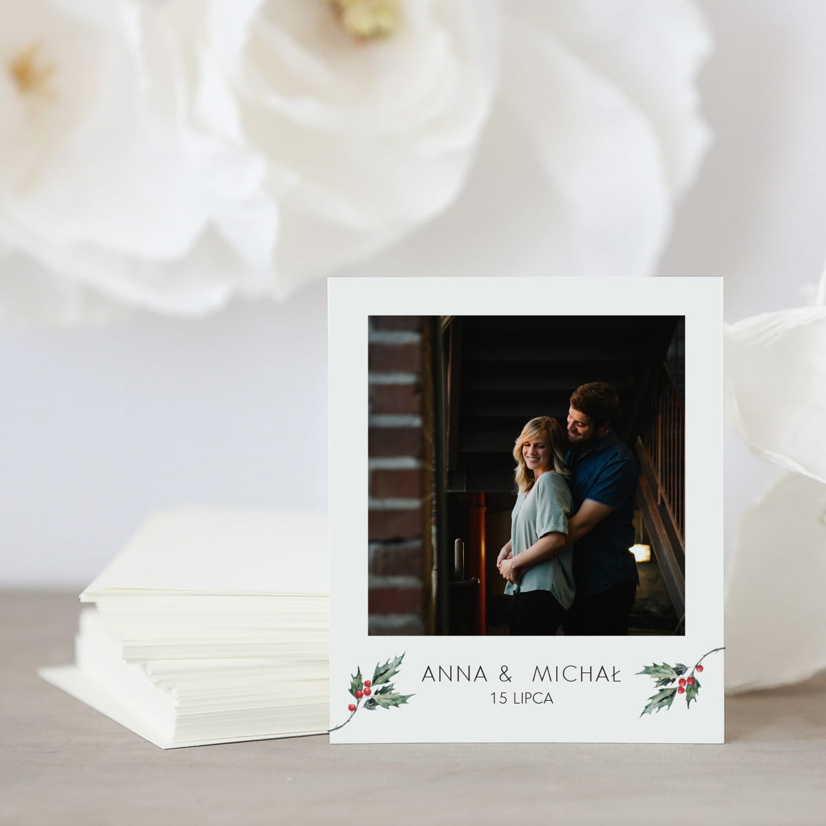 Polaroidy weselne drukowane są na grubym białym 350 g, kremowym 300 g lub fotograficznym papierze wysokiej jakości.