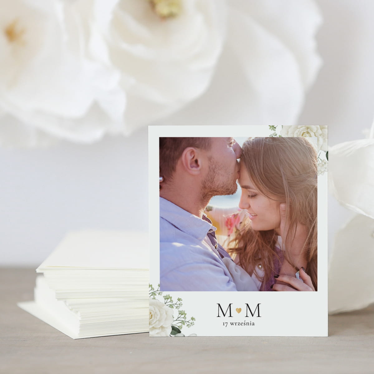 Podziękowania ślubne polaroid z nadrukiem Waszych imion i daty ślubu gościa elegancką i ozdobną czcionką.