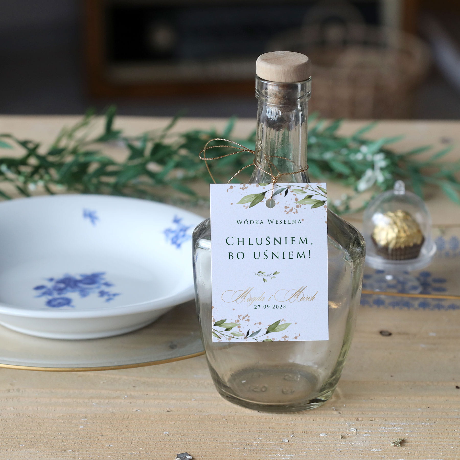 Zestaw 18 zawieszek na alkohol z zielono-złotą gałązką