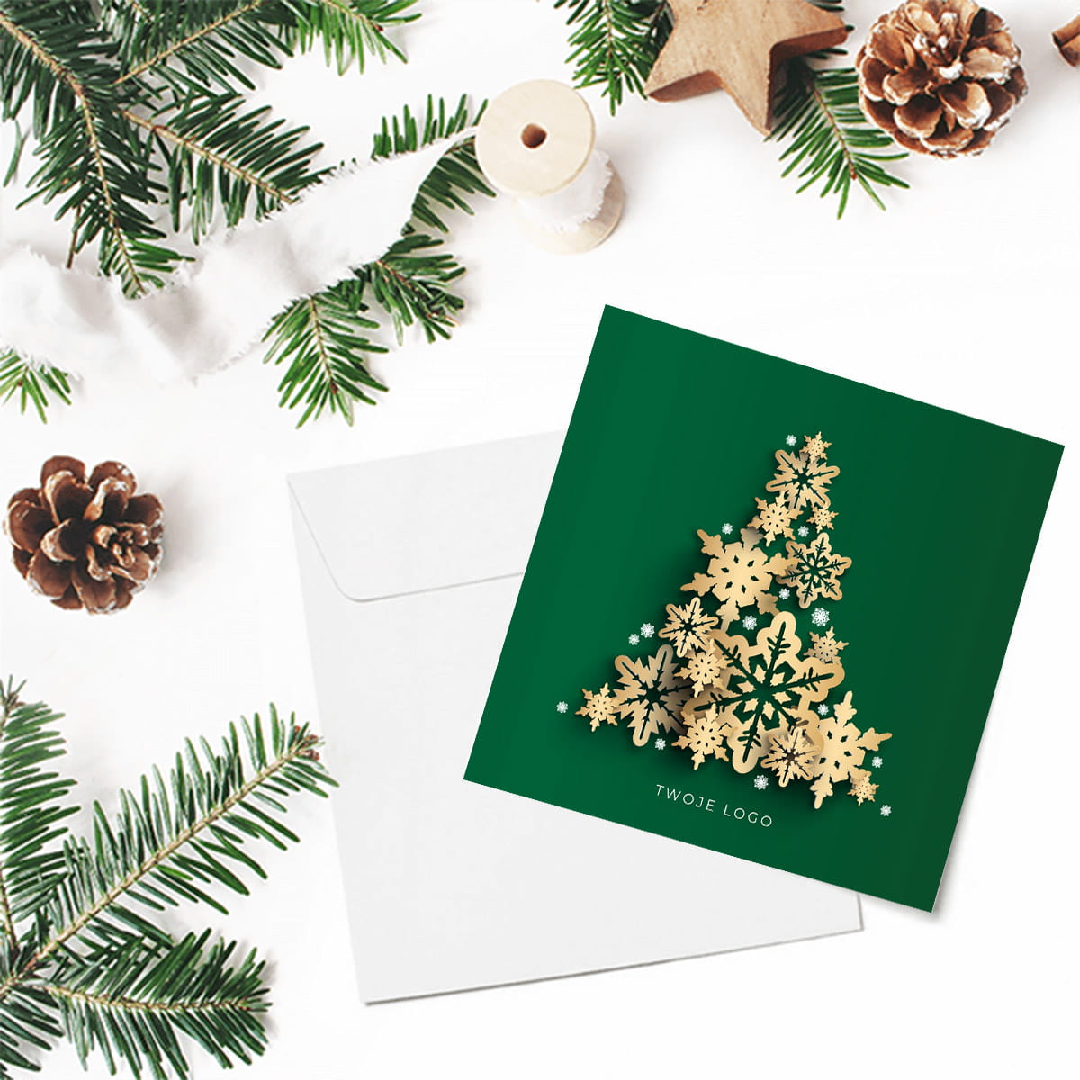 Zielone kartki firmowe na Boże Narodzenie ze złotą choinką - 14,5x14,5 cm