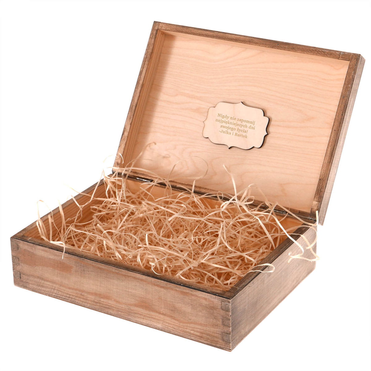 Taką grawerowaną tabliczkę umieścimy w pudełku na górze wieczka - środek pudełka wypełniony jest drewnianym siankiem