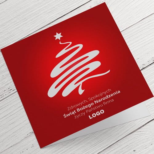 Kartki świąteczno-noworoczne dla firm - wzór z białą choinką na czerwonym tle.