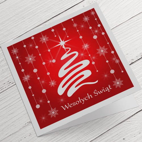 Kartki świąteczno-noworoczne dla firm - wzór z białą choinką i zimowymi ozdobami na czerwonym tle.