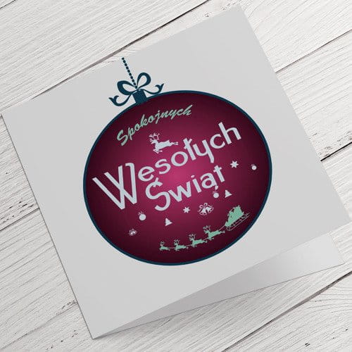 Kartki firmowe na Boże Narodzenie z zaprzęgiem w bombce - 14,5 x 14,5 cm