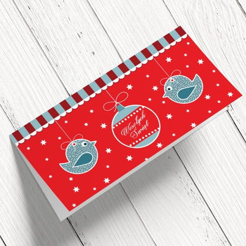 Radosne Kartki świąteczno-noworoczne dla firm - wzór bombka z ptaszkami, czerwona, format DL