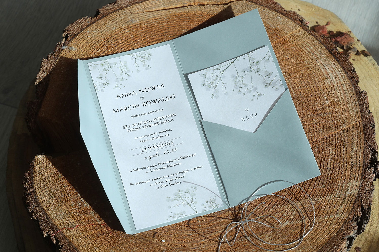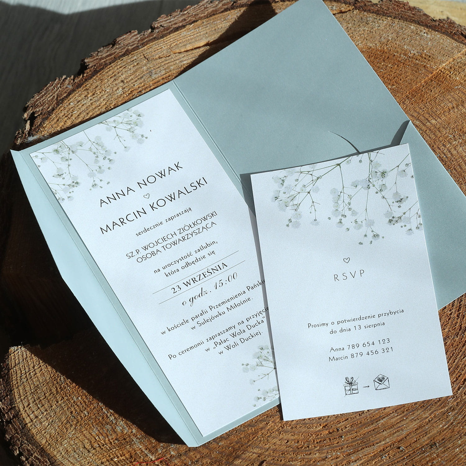Srebrne zaproszenia ślubne z motywem gipsówki