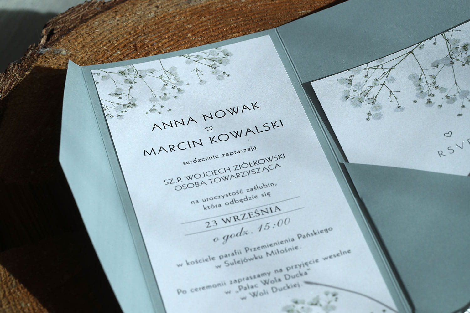 Srebrne zaproszenia ślubne kolekcja Vintage z motywem kwiatów gipsówki