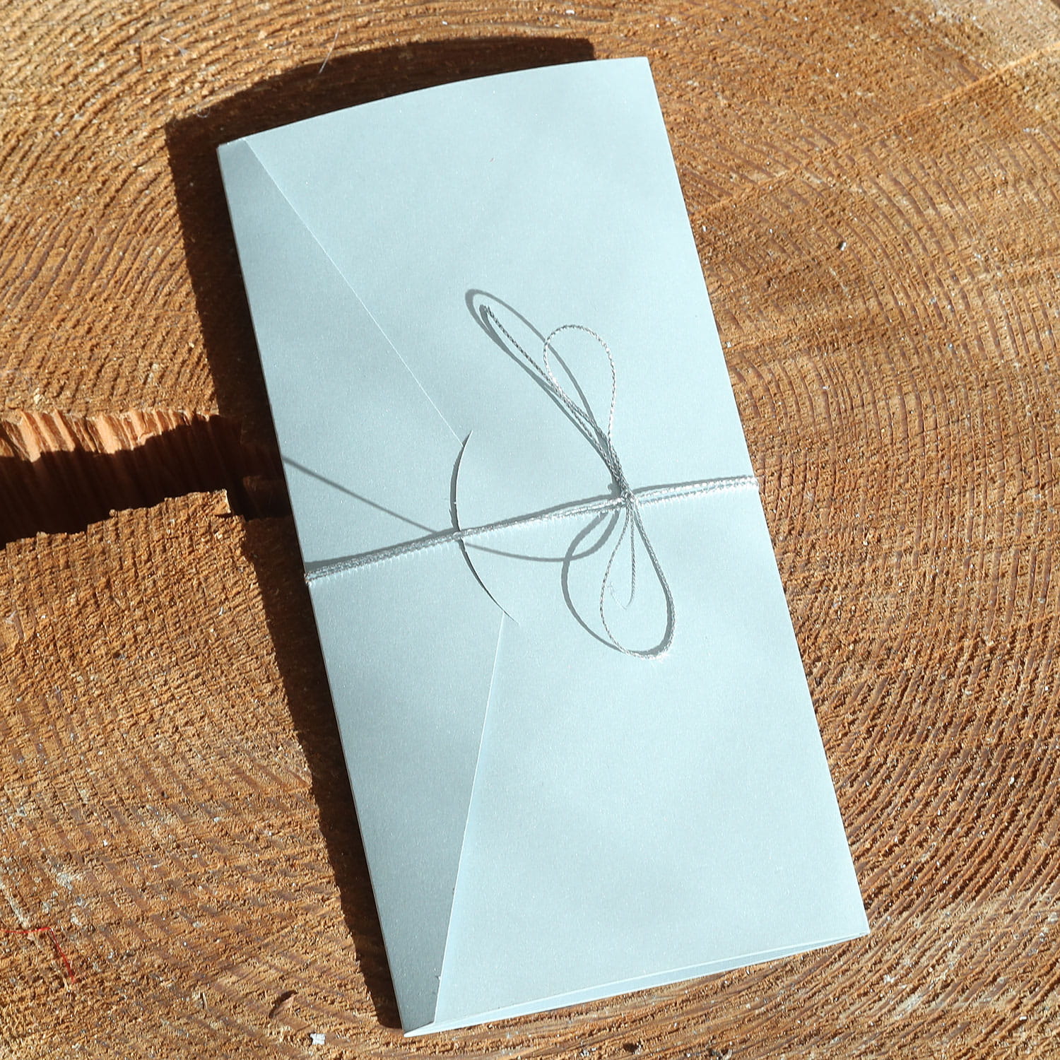 Zaproszenie ślubne zostało wykonane ze srebrnego i białego papieru perłowego. W środku znajduje się treść zaproszenia oraz specjalna kieszonka na bilecik z dodatkowymi informacjami. Całość została przewiązana dwukrotnie srebrnym sznurkiem. To subtelne i eleganckie zaproszenie, które pięknie podkreśli klimat Twojego ślubu.