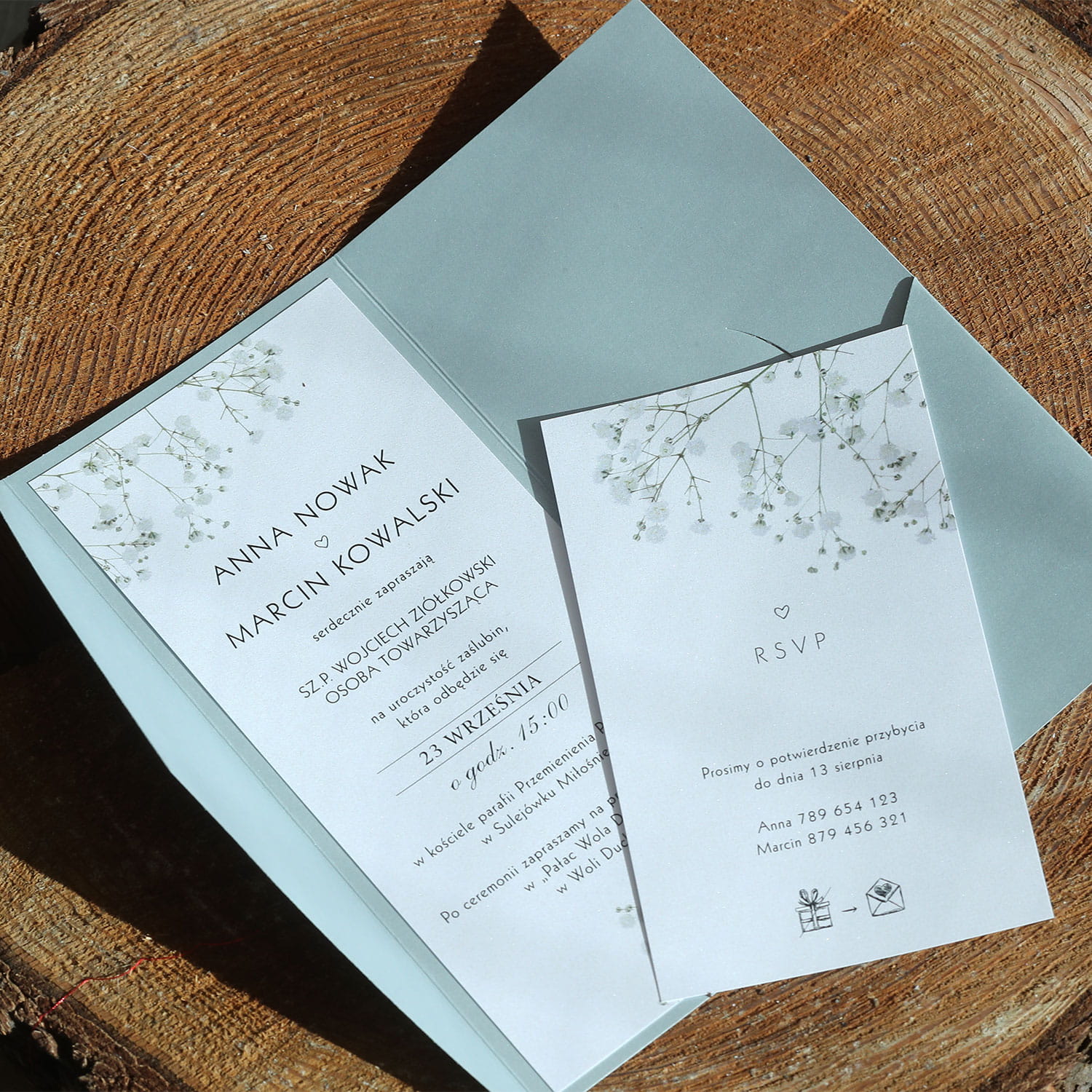 Dołącz do zamówienia treść zaproszenia uzupełnioną o wasze dane, miejsce ślubu i przyjęcia, telefonami z imionami do potwierdzenia, oraz wybrane cytaty i rebusy.