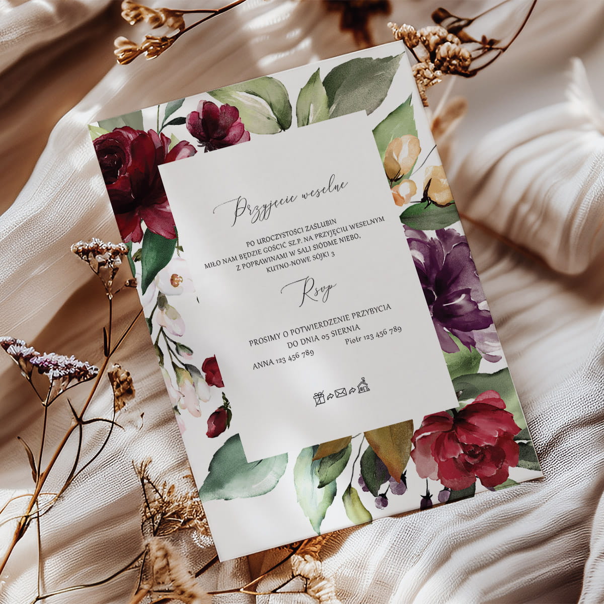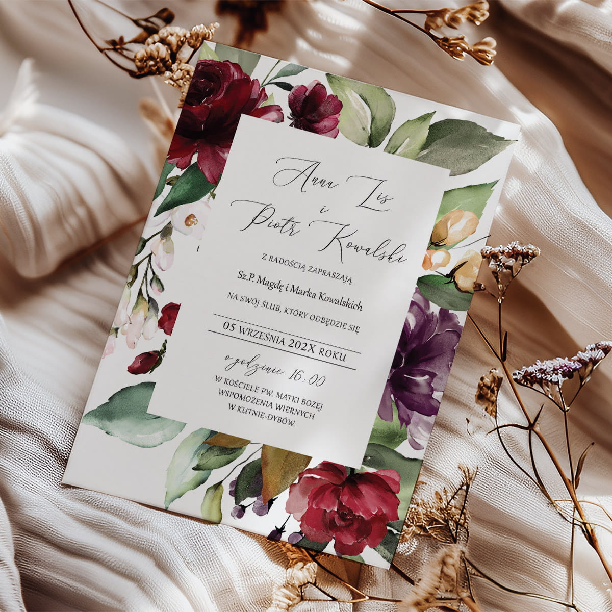 ZAPROSZENIE ŚLUBNE BOHO Z BORDOWYMI KWIATAMI BOHO