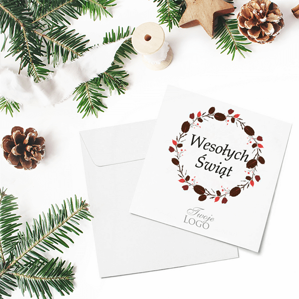 Kartki firmowe na Boże Narodzenie drukowane z delikatnym liściastym wianuszkiem - 14,5x14,5 cm