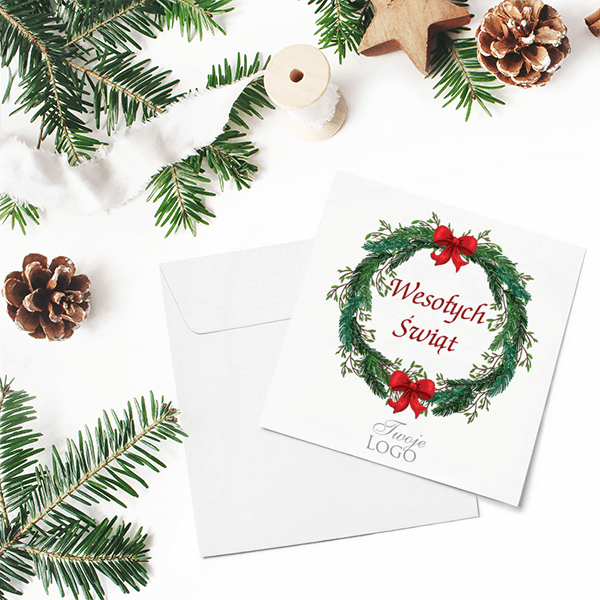 Kartki firmowe na Boże Narodzenie drukowane z grafiką ozdobnego świątecznego wieńca - 14,5x14,5 cm