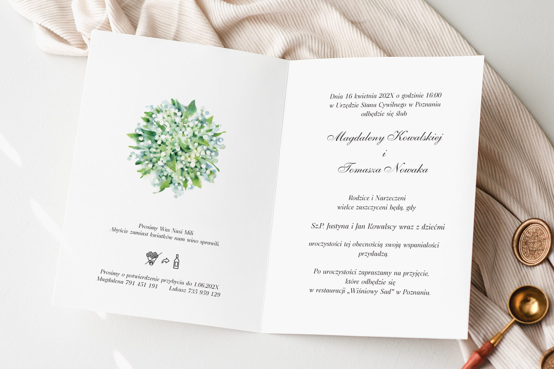 Dołącz do zamówienia treść zaproszenia uzupełnioną o wasze dane, miejsce ślubu i przyjęcia, telefonami z imionami do potwierdzenia, oraz wybrane cytaty i rebusy.