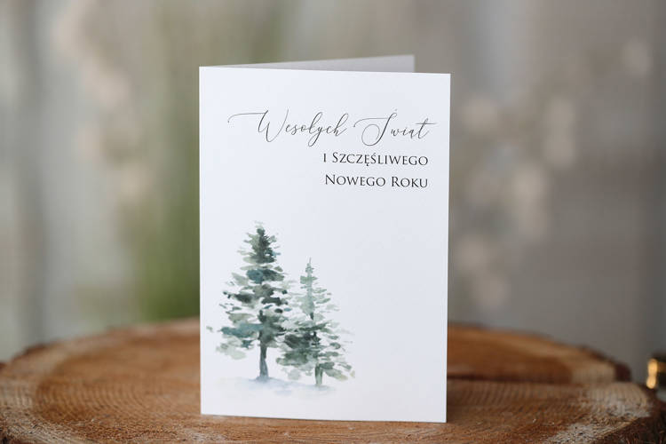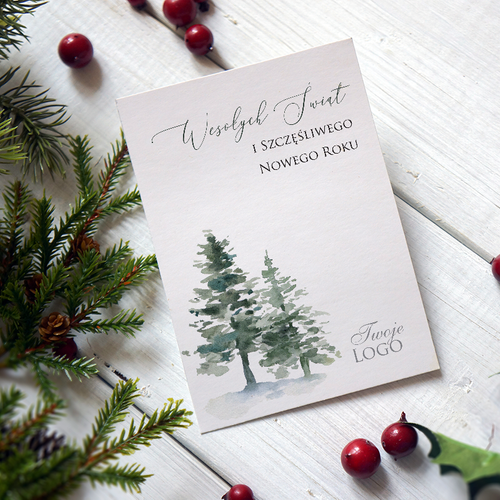 Kartki świąteczno-noworoczne dla firm - bardzo ładny wzór z akwarelowymi drzewami.