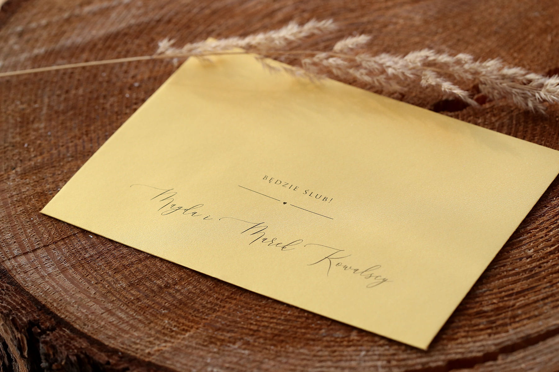 Koperty w pięknym złotym kolorze idealnie pasują na ozdobę zaproszeń. Wpasują się w uroczystości w stylu glamour i vintage.