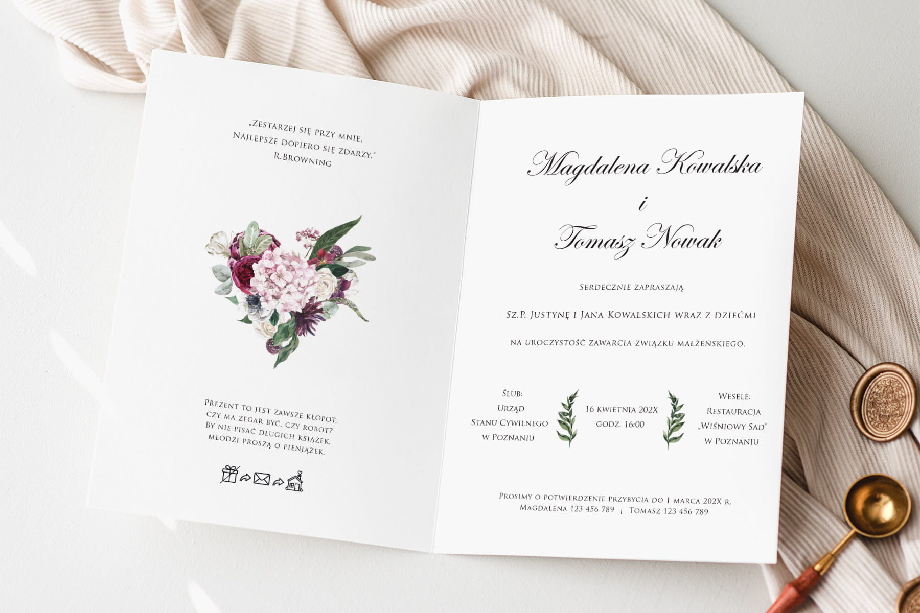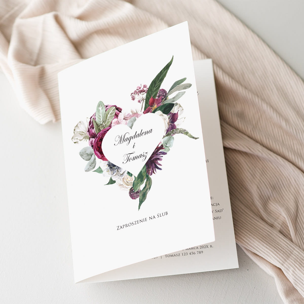 Zaproszenia ślubne drukowane z kwiatowym motywem w sercu