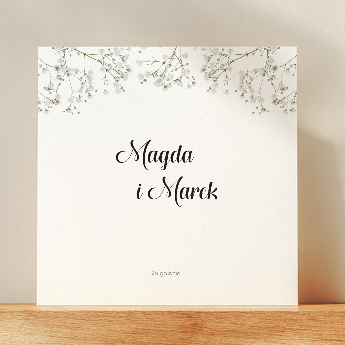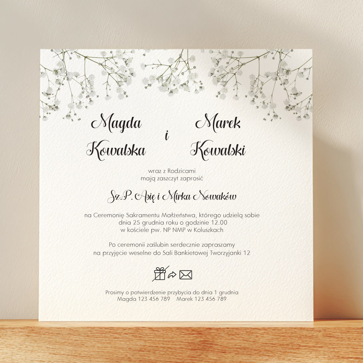 Jednokartkowe, kwadratowe zaproszenie z kwiatami gipsówki.