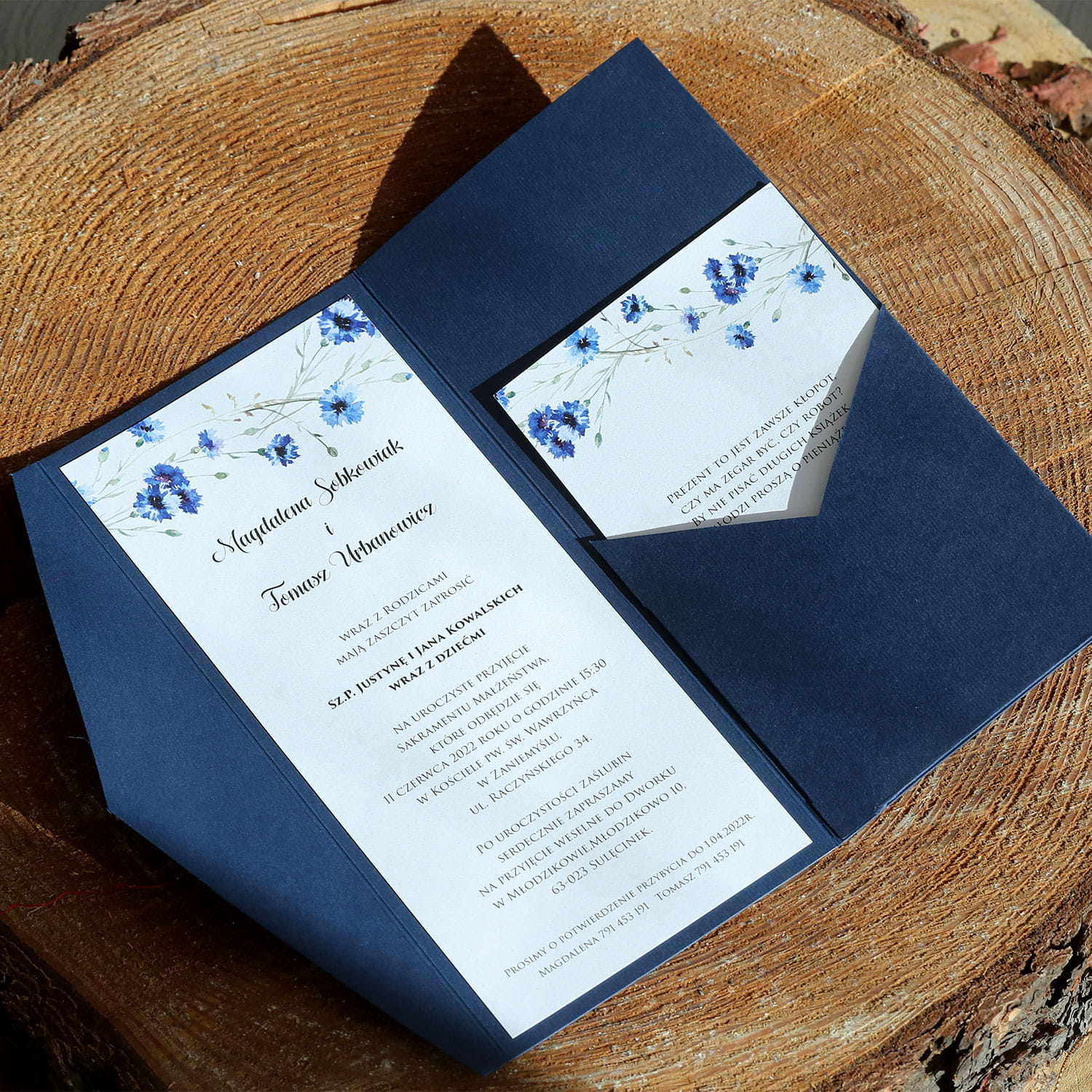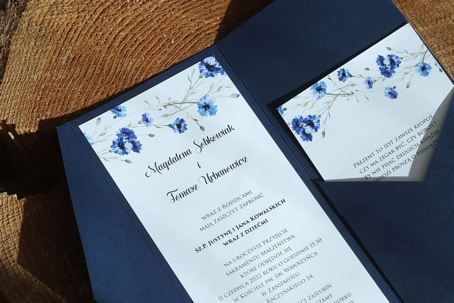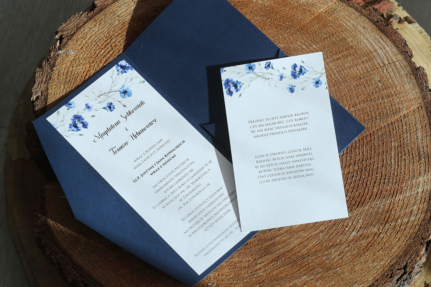Dołącz do zamówienia treść zaproszenia uzupełnioną o wasze dane, miejsce ślubu i przyjęcia, telefonami z imionami do potwierdzenia, oraz wybrane cytaty i rebusy.
